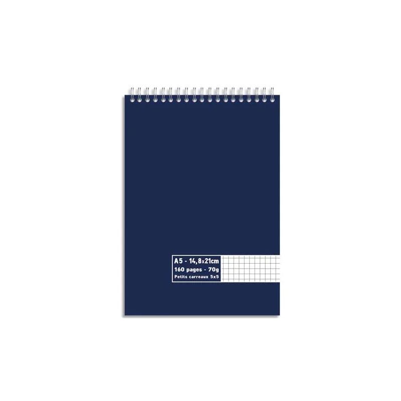Fabriqué en France Bloc 70g spirale en tête 160 pages quadrillées 5x5. Format A5 14,8 x 21 cm
