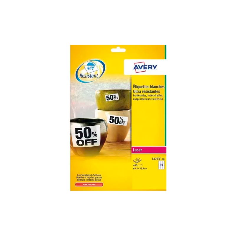 En polyester Blanc, inaltérable et indéchirable. Résiste aux salissures, à l'huile, l'humidité, aux U.V. et températures de –20°C à + 80°C. Parfaite pour un stockage en milieu hostile. Applicable sur bois, vernis, métal, verre...