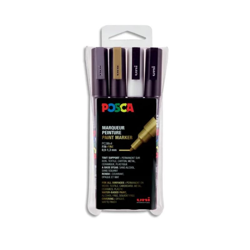 UNI Pochette de 4 marqueurs POSCA. Pointe fine conique 0,9-1,3mm. Coloris : or, argent, noir, blanc.